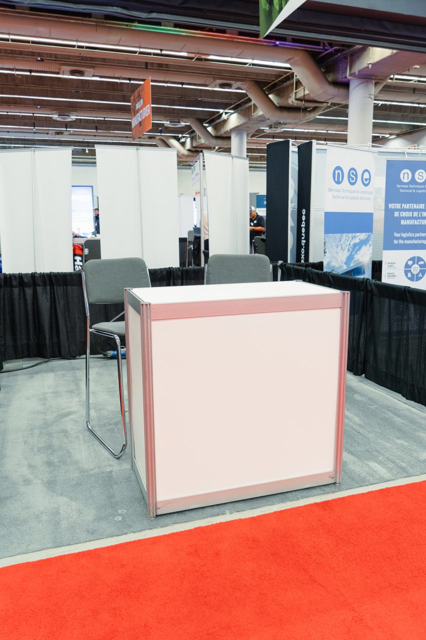 - Carpet, wastebasket and curtains (height of the bottom of the booth: 8′; height of the sides: 3′)